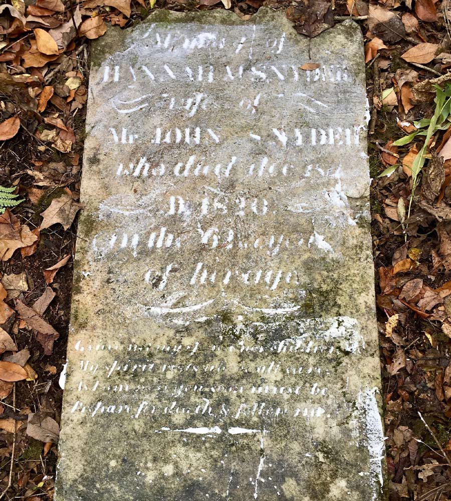 Hannah and John Snyder farmed the land directly to the southeast of the Jacobie farm. John was a Revolutionary War veteran who died in 1833 at the age of 77. They are buried on the farm along with two small unmarked headstones. For most of the 20th century, the land was used for pasture, hay, and small grains.