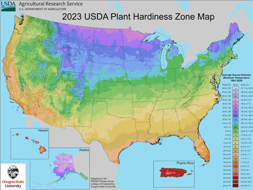 The USDA publishes a variety of Plant Hardiness Zone Maps. We find them to be very useful when determining if a given species will work well in a given area.